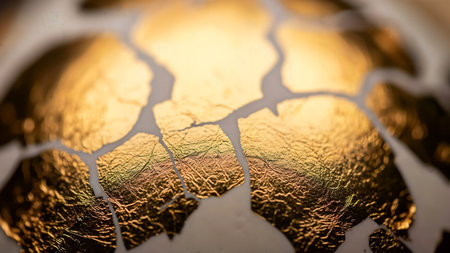 Cracked gold surface on a white background, showcasing shimmering texture and reflective light, symbolizing strength.