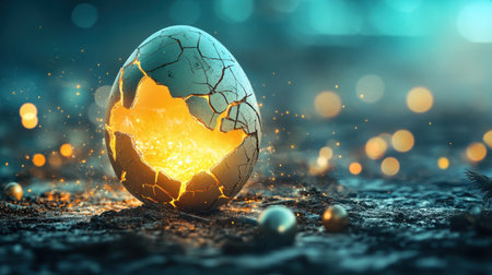 A visually captivating image of a cracked egg emitting a warm glow, set against a mystical backdrop. This captivating scene evokes feelings of wonder and new beginnings.