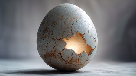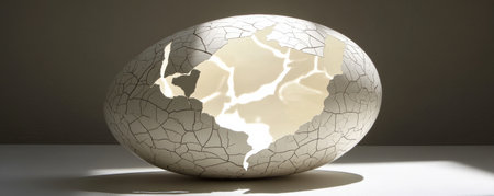 A conceptual image with a whole egg with cracked eggshell with light streaming through the cracks, symbolizing resilience and the beauty of imperfection.