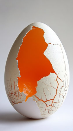 Cracked white egg with vibrant orange interior on plain background. Creativity and breaking boundaries concept