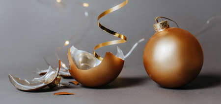 Broken Christmas ornament with ribbons and lights on a dark gray