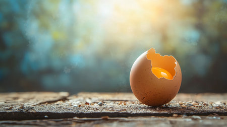 A cracked brown egg with visible yolk, placed on a rustic wooden table, illuminated by soft natural light with a blurred green background.