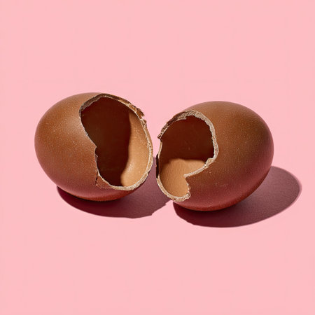Two brown eggshell halves are positioned on a pink background in an overhead shot. The shells display rough textures and the lighting suggests a studio environment. This composition could be used for food, health, or conceptual design purposes. The image offers copy space for commercial projects.