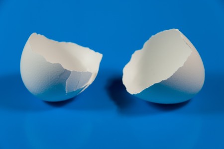 Two halves of broken eggshell (on a blue background)