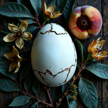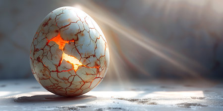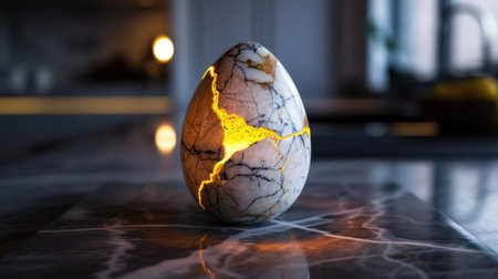 This stunning image features a cracked marble egg emitting a soft glow, symbolizing transformation and new beginnings. The elegant design rests on a dark background, creating contrast.