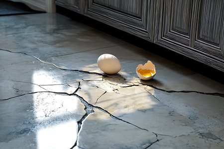 View of a broken egg with spilled yolk and a whole egg on a cracked grey floor, positioned near a dark patterned cabinet's edge. Crack patterns radiate from the egg.