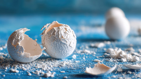 A stunning close-up image showcases cracked eggshells on a vibrant blue surface, combining natural beauty with culinary imagery perfect for food-related themes.