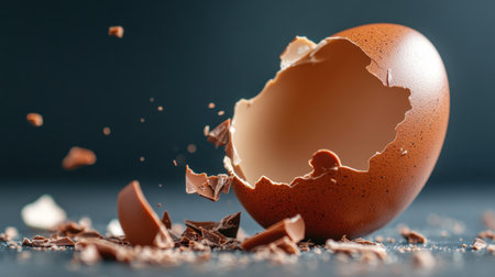 Close-up of a broken chocolate egg with crumbs and shards spilling outward on a dark backdrop