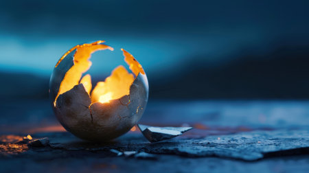 A fragmented eggshell rests on a dark surface, emanating a warm glow from within. This striking image symbolizes hope and new beginnings, evoking a sense of mystery and wonder.