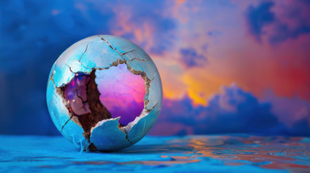 This artistic image features a cracked blue eggshell reflecting vibrant colorful clouds at sunset, creating a serene and dreamy atmosphere.