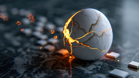 A stunning digital artwork featuring a shattered white sphere illuminated with glowing cracks, set against a rich dark marble surface. This piece symbolizes transformation and energy.
