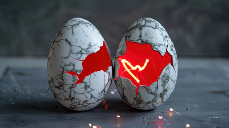 This captivating image features cracked marble eggs that glow with a striking red light, creating a magical atmosphere full of creativity and surprise.