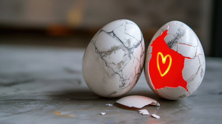 This captivating image features a cracked white egg revealing a heart shape glowing within, conveying themes of love and new beginnings in a tranquil setting.