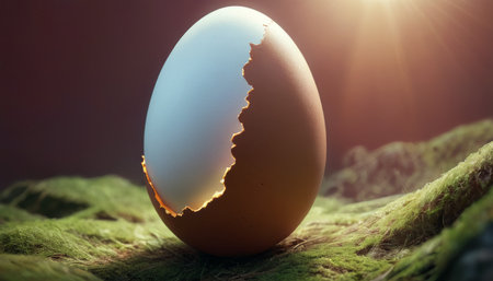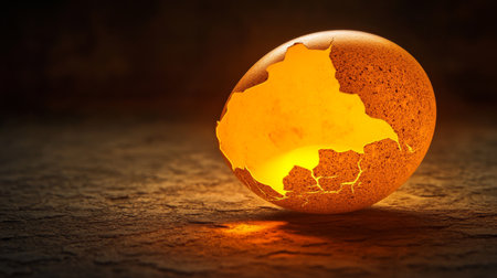 A cracked egg with light spilling out, symbolizing the birth of a new and innovative idea from an unexpected source.