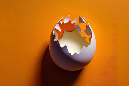 An artistic representation of a cracked egg with a striking purple design, perfect for themes of creativity and modern artistry in food and decoration.