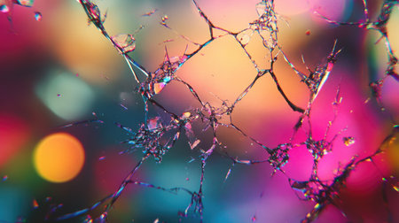 Close-up view of a shattered glass surface illuminated by vibrant colors, showcasing intricate patterns and reflections that inspire creativity in design.
