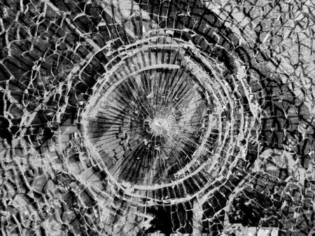 Broken glass shards creating a radiating pattern from the center, against a dark, blurred background