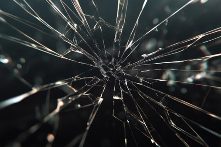 Close-up view of a broken glass piece, showcasing a stunning shattered pattern. The interplay of light and dark creates an evocative atmosphere.