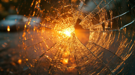 Close-up of a shattered glass pane highlighting the intricate patterns of cracking