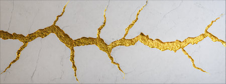 Gold crack running through textured wall creates kintsugi inspired abstract background with elegant decorative design concept.