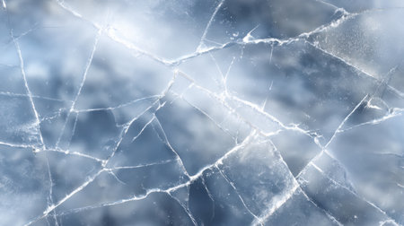 This image depicts a close-up view of a cracked ice surface featuring intricate patterns and blue tones, ideal for use in design, backgrounds, and creative projects.
