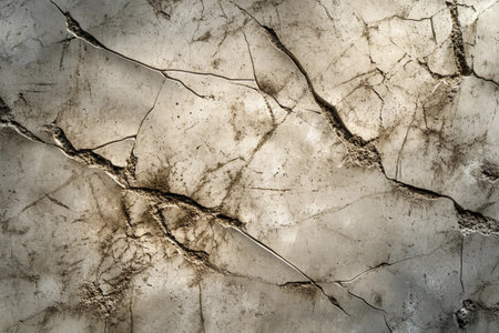 Beneath the soft light, a grey-brown concrete surface reveals a tapestry of cracks and imperfections, telling a story of time and weathering in an urban landscape during late afternoon.