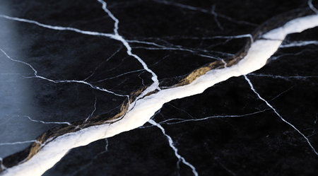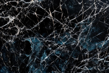 A detailed view of broken dark marble revealing delicate white streaks, emphasizing texture, contrast, and the beauty of fractured natural stone.