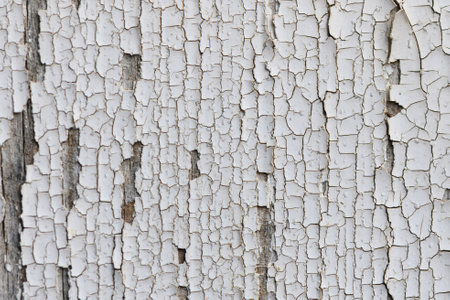 Close-up view reveals the fascinating details of peeling white paint on weathered wood, highlighting the passage of time through cracks and layers under soft daylight.