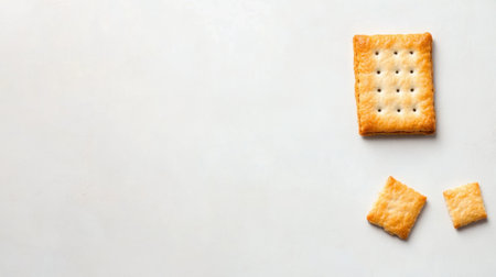 A visually appealing composition featuring a crunchy square snack alongside two smaller pieces on a smooth, light background. Perfect for culinary and food photography.