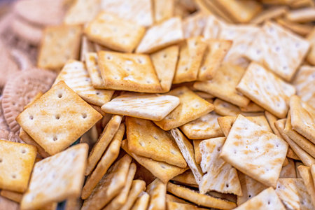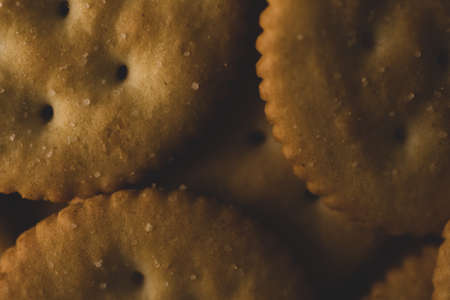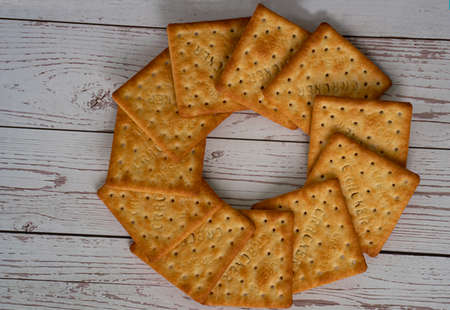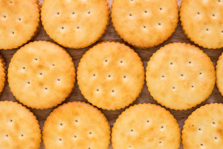 A bunch of cream crackers arranged in a circle. Selective focus points. Blurred background