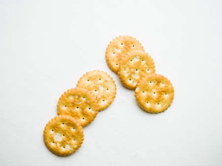 Crispy round crackers on white background. Dry crunchy cookies. Studio shot.