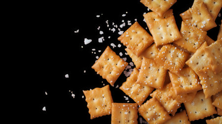 Deliciously golden crackers scattered on a textured surface, captured with a dynamic angle