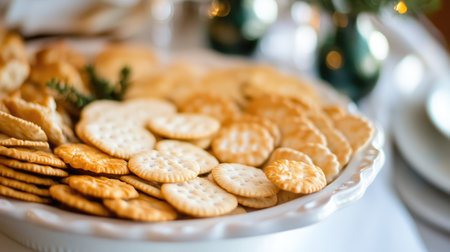 A beautifully arranged platter of assorted crackers and snacks, perfect for a festive gathering. This inviting display highlights the delectable textures and colors, creating a warm atmosphere for any occasion.