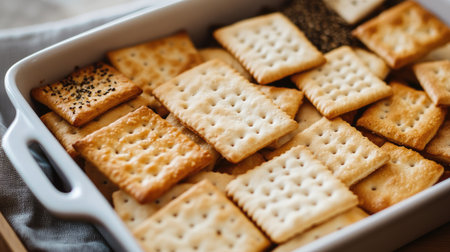 A beautiful assortment of assorted crackers displayed in a baking dish, showcasing various textures and colors perfect for any snack occasion or gathering.