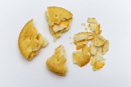 Biscuit and crumbs of sandwich cracker Cheese flavoured ,Cream and butter. Crunchy delicious sweet meal and useful cookies. On white background.