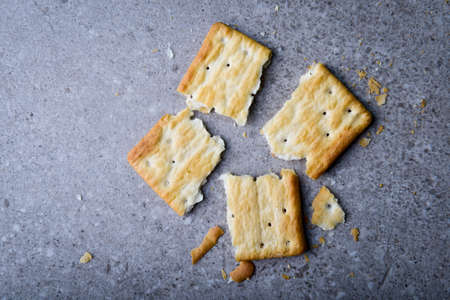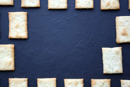 Groceries, snacks, food. Salted crispy crackers on a gray textured surface.