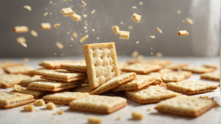 Crackers and sugar cubes falling through the air against a dark background creating a playful and dynamic visual