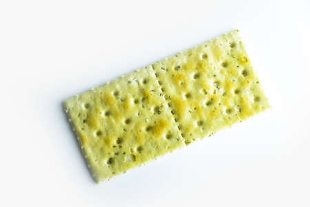 A high angle closeup shot of a delicious salty cracker on a white surface