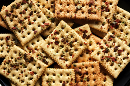 Savory crackers arranged on a dark surface ready for snacking at any time of day