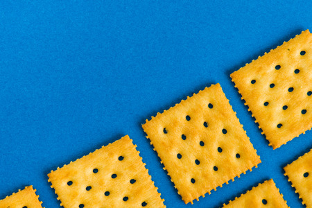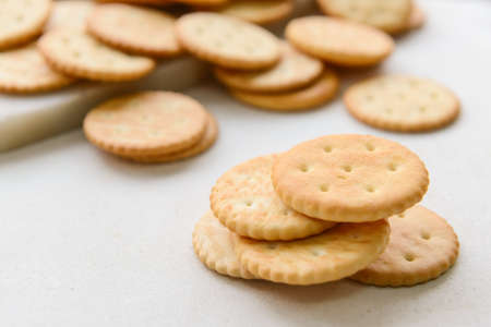 Close up Stack of Sweet Crunchy Crackers isolated on abstract background. Flat Lay.