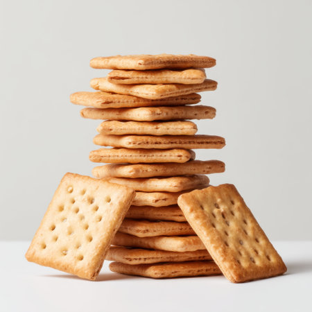 A visually appealing arrangement of stacked golden brown crackers showcases their crisp texture against a clean white background, perfect for food-related imagery or snack inspiration.
