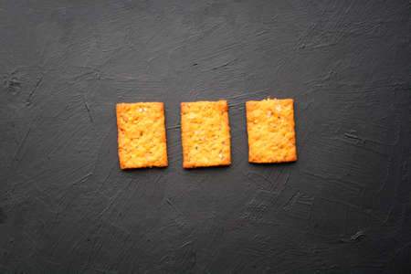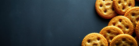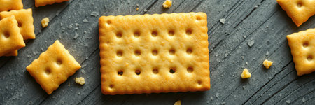 Golden crackers arranged on a dark stone surface showcasing their texture and shape during a snack time setting