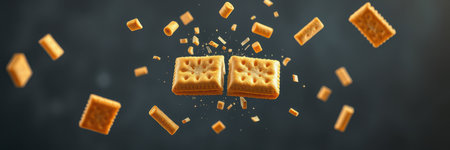 Golden cookies collide in mid-air, breaking into smaller pieces that highlight their crunchy texture. The contrast against the dark background emphasizes the movement and energy.