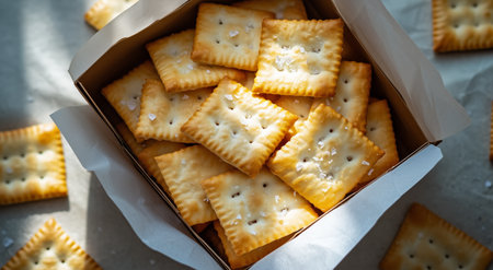 A box filled with crispy golden crackers sits on a light surface, inviting snack lovers. Sunlight highlights the texture, making them irresistible for afternoon munching.
