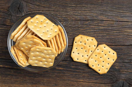 Tasty square crackers in glass bowl on old wooden table, top view