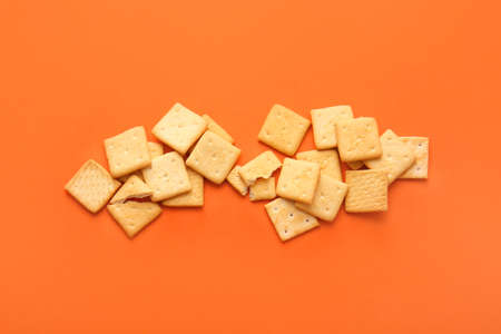 Tasty crackers on color background
