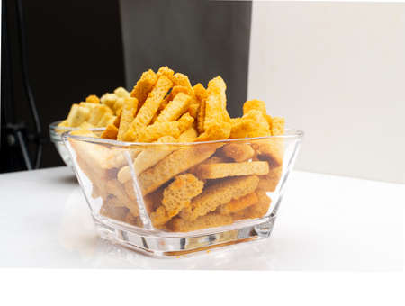 Homemade crunchy croutons with garlic, salt, herbs and spices. Spicy rusk sticks, seasoning rusks, small fried bread snacks, salted breadsticks, beer appetizer