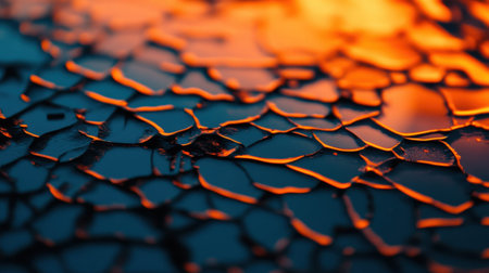 This captivating close-up image showcases a cracked surface illuminated by warm orange and cool blue tones, creating a striking visual contrast. Perfect for abstract art enthusiasts.