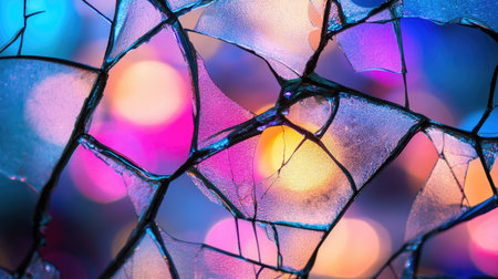 This close-up photo captures the intricate details of broken glass, highlighting colorful light reflections and unique textures for creative use.