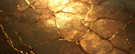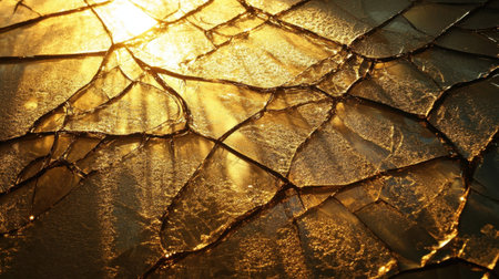 A close-up view reveals a cracked, dark surface with complex patterns. Golden light highlights the cracks, showing their texture and depth, creating a striking visual effect.